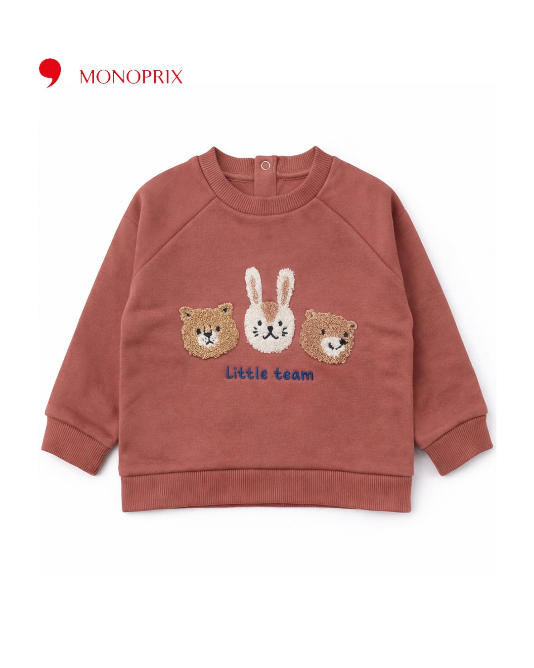 Add a touch of cozy charm to your little one’s winter wardrobe with this adorable terry sweatshirt. Designed in a warm rust tone, it features cute embroidered animal faces with the playful text “Little Team” on the front, making it perfect for everyday wear.