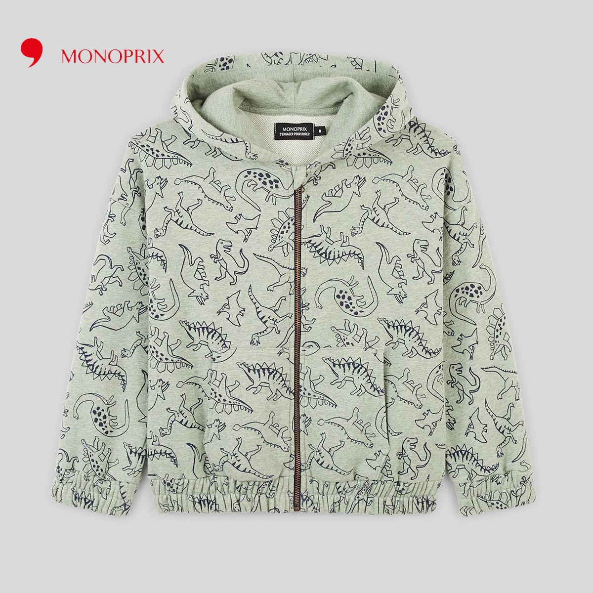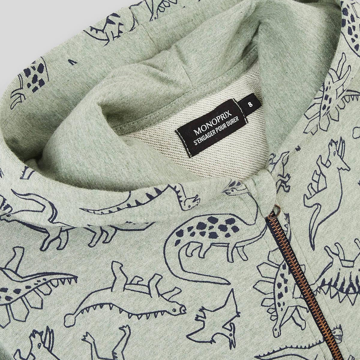 MONOPRIX GREEN DINO PRINTED ZIPPER HOOD