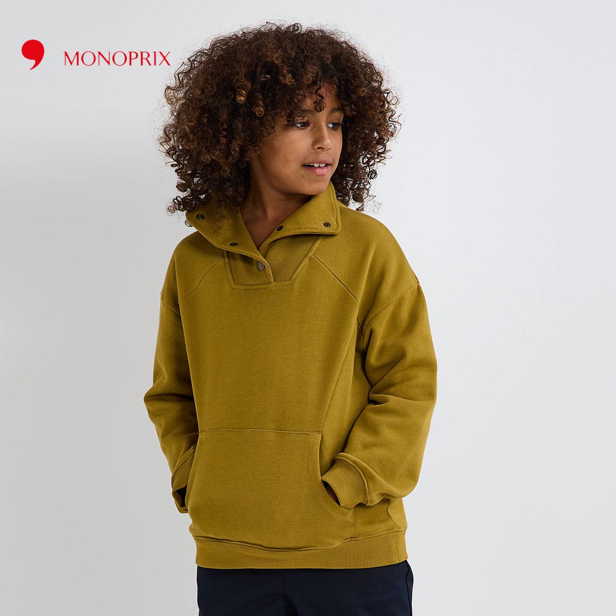 Plain fleece sweatshirt Straight cut High collar with press studs Soft and warm knit A kangaroo pocket on the front Ribbed cuffs and bottom of the body OEKO-TEX: an international label that guarantees the absence of substances harmful to health and skin. The model is 1m30 tall and wears a size 10 years. Model number: T31660264
