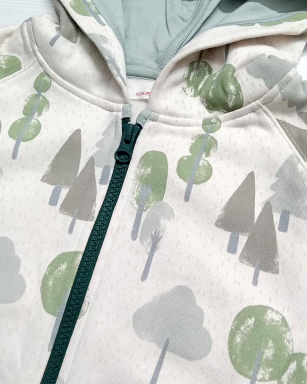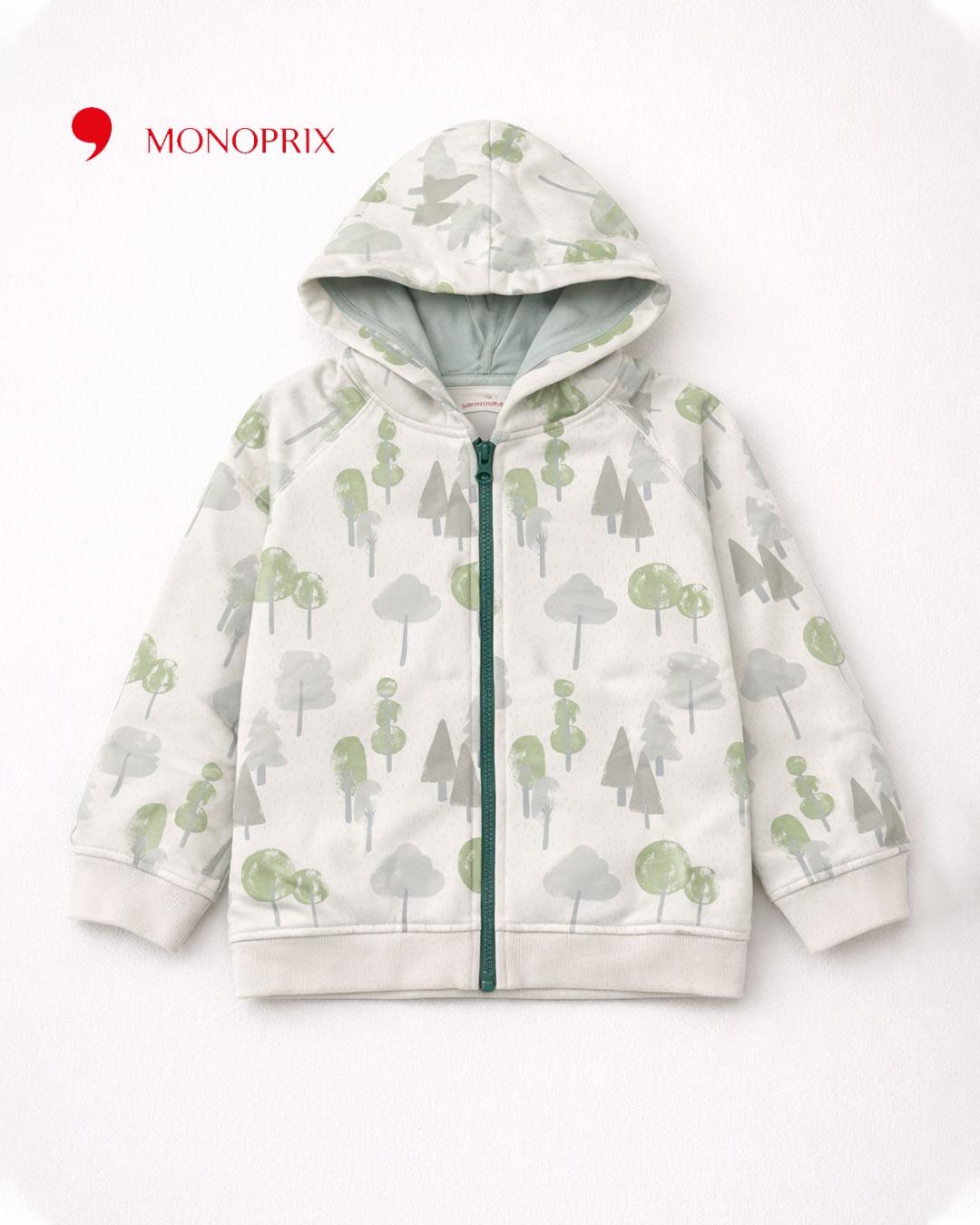 A cozy and playful layering essential, this hooded zip-up jacket is perfect for cooler days. Designed in a soft off-white base, it features an all-over nature-inspired tree print that adds a fresh and charming touch to your little one’s everyday look.