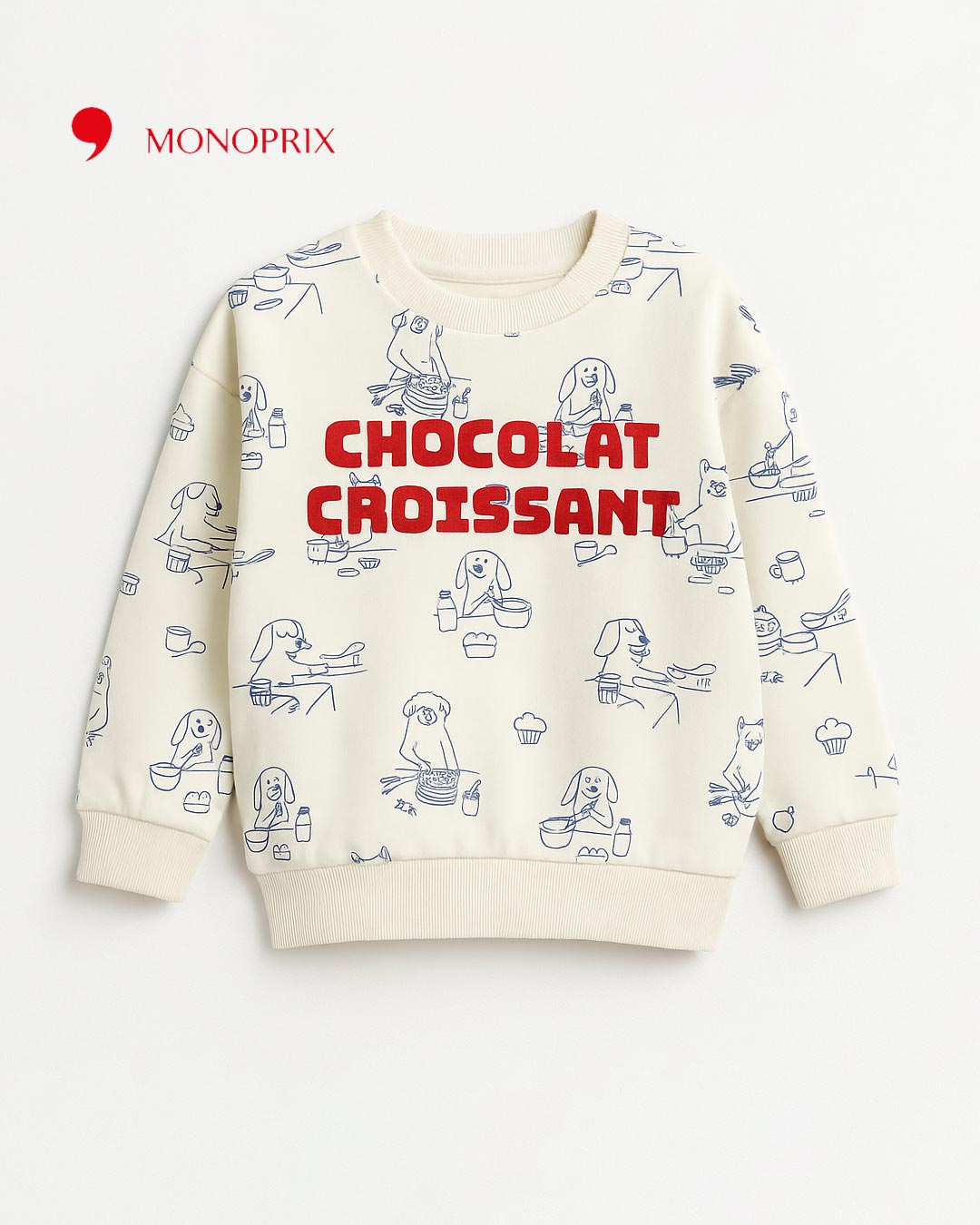 This kids cream sweatshirt features bold CHOCOLAT CROISSANT text with playful doodle prints for a fun and trendy look. Crafted from soft fabric with ribbed cuffs and hem, it offers both comfort and style for everyday wear.