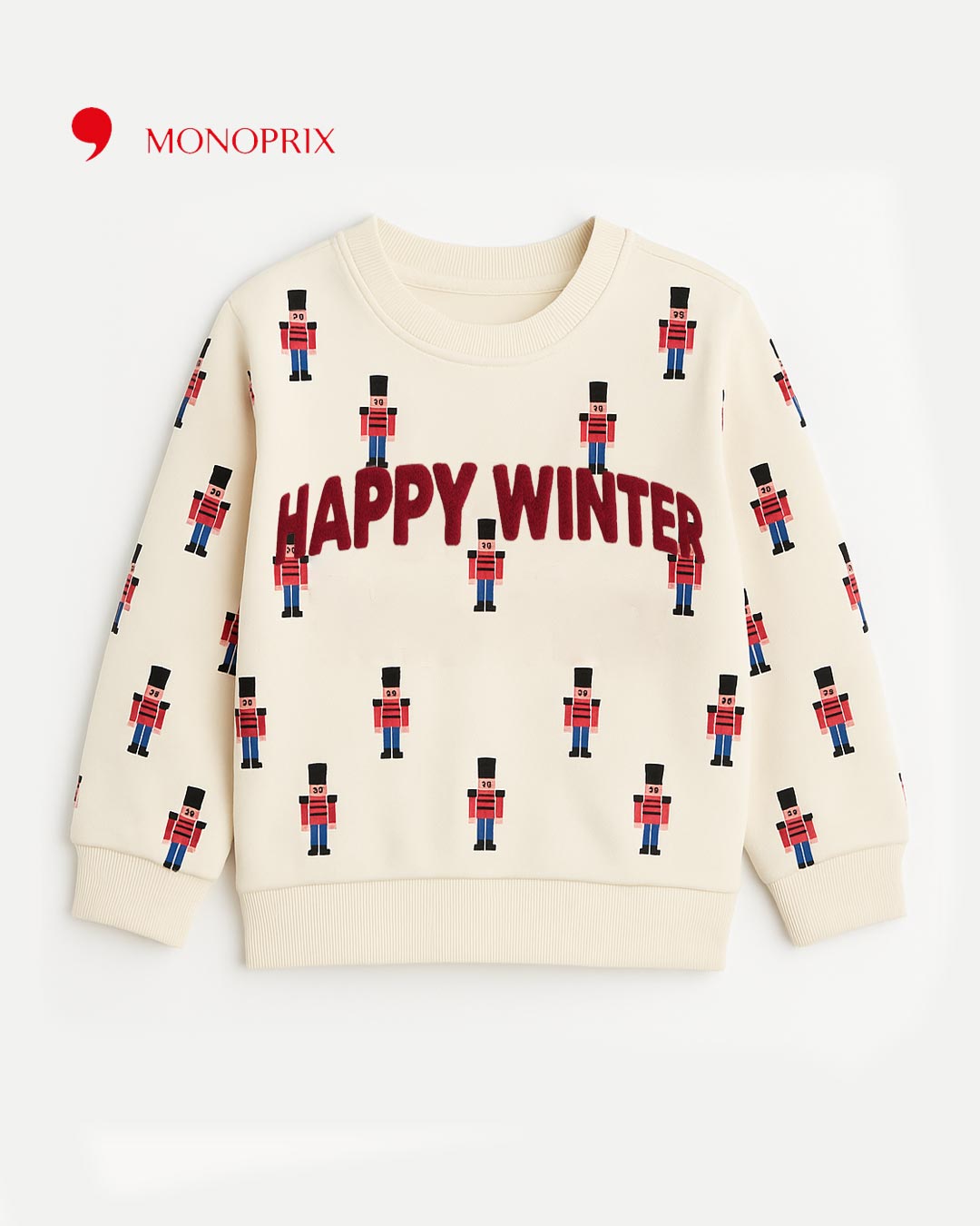 Celebrate the cozy season in style with this cream-colored sweatshirt featuring a fun all-over toy soldier print and bold HAPPY WINTER chenille embroidery across the chest. A perfect mix of festive charm and comfort for kids.