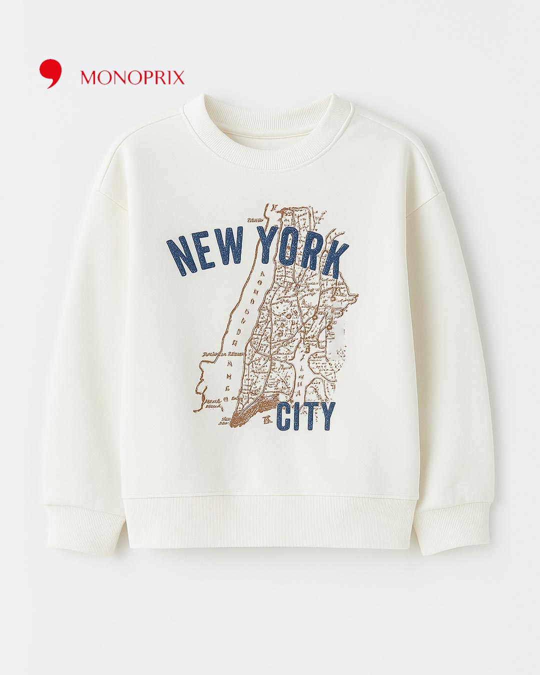 Bring urban style to your child’s wardrobe with this off-white sweatshirt featuring a bold New York City graphic and vintage-inspired map print. A perfect mix of comfort and cool, this piece is made for kids who love standout fashion.
