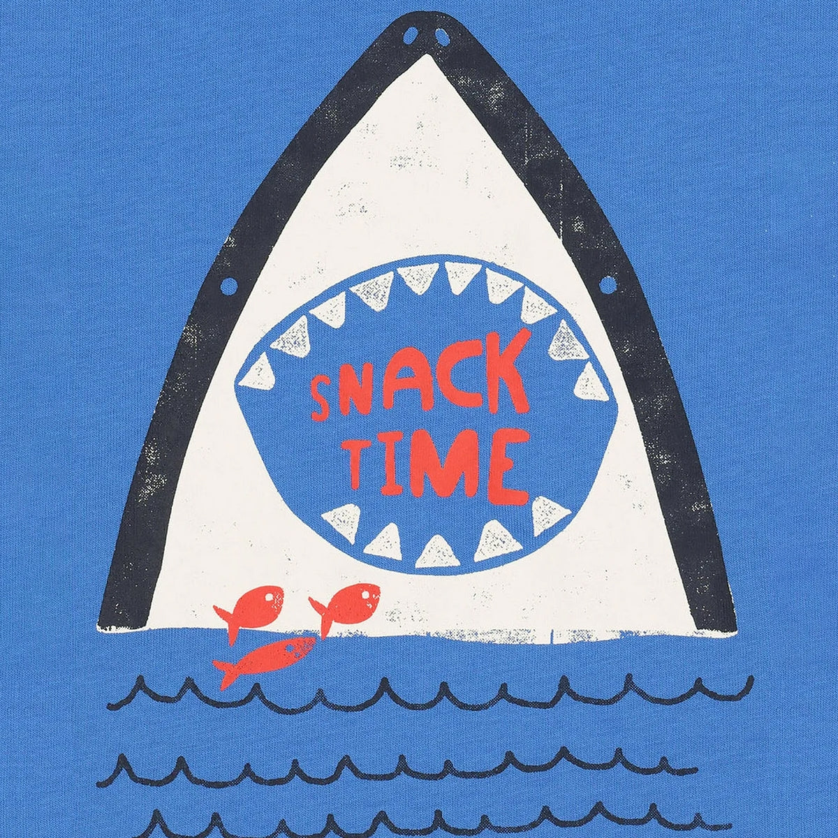 Blue shark bite t-shirt At a glance we know how much your little ones love cool sharks (and snacks!). that's why weve crafted this awesome tee, featuring fun, sea-inspired prints for a summer-holiday feeling. wear it with their favorite jeans and shorts for lots of relaxed looks. Features and benefits blue t-shirt with short sleeves with shark, fish and wave print snack time lettering shoulder poppers on sizes up to and including 12-18 months our poppers are nickel-free to prevent irritating delicate skin 100% cotton for comfort 100% cotton