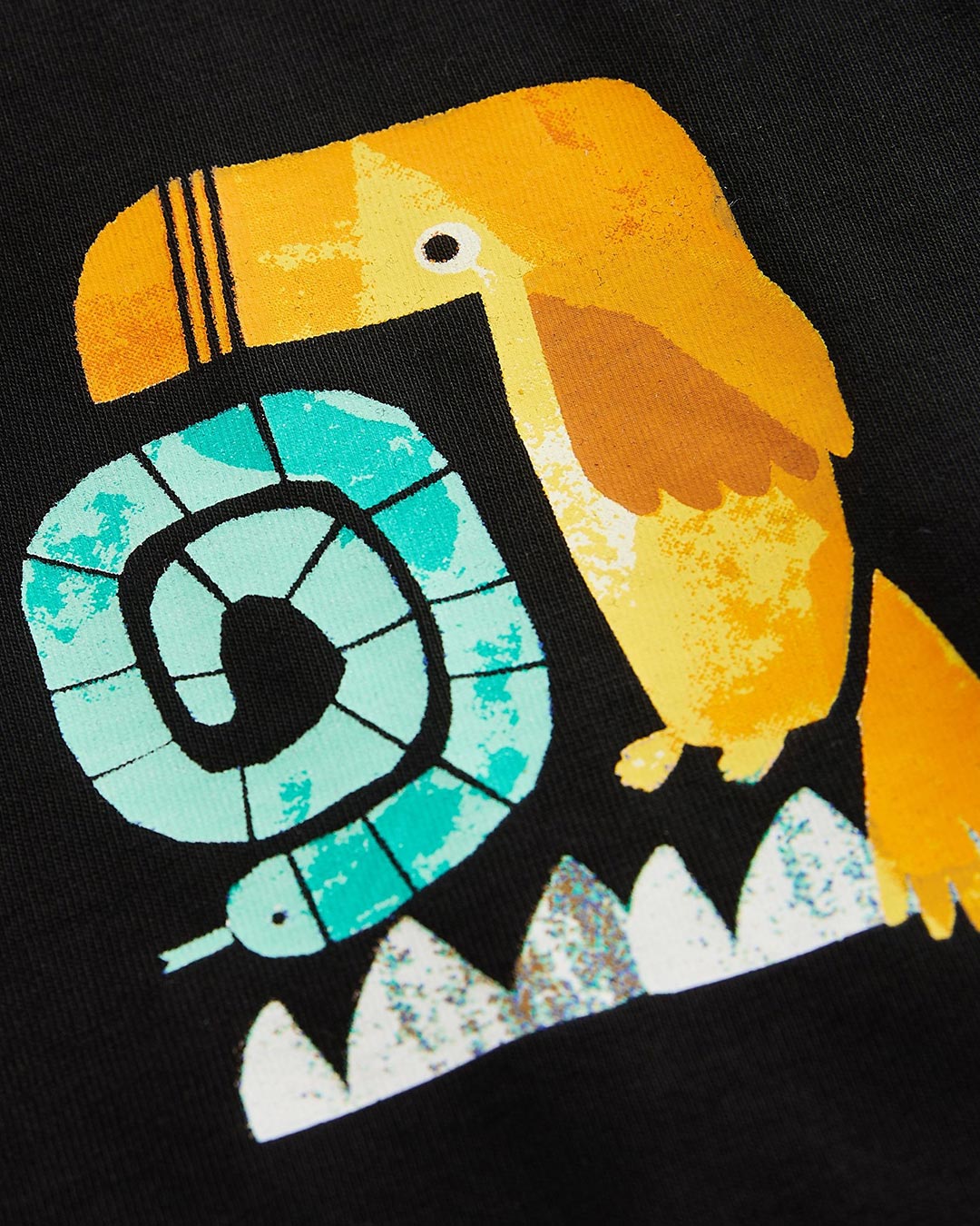 This stylish t-shirt features a parrot chest and back print, set against a black pure cotton base with a ribbed crewneck collar.