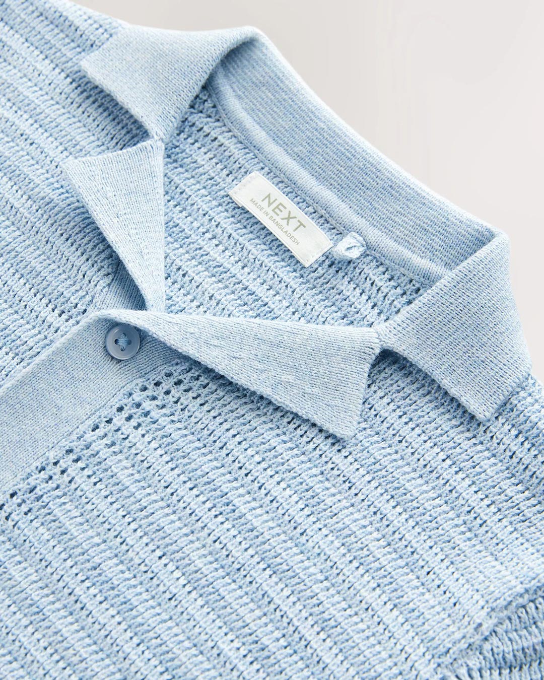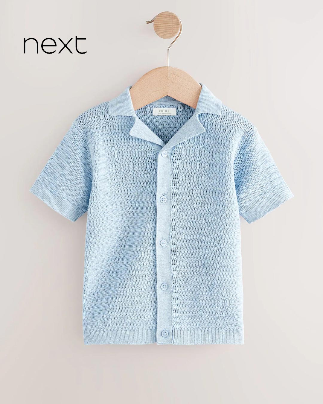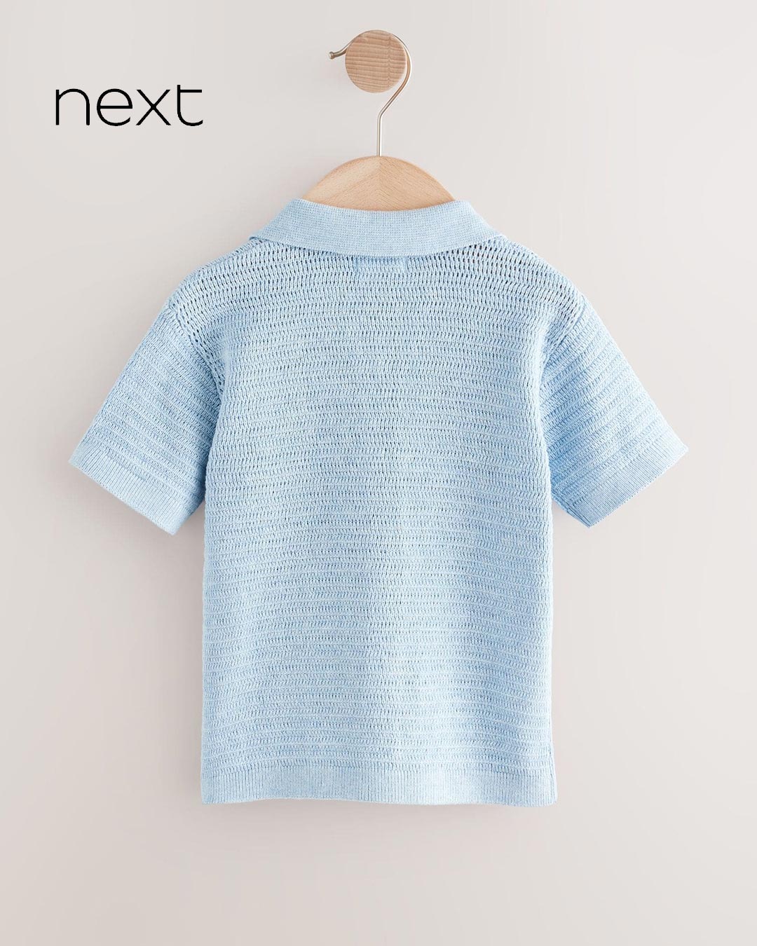 This light blue knitted cotton polo shirt from Next combines classic charm with modern comfort. Featuring a soft textured weave and a button-down front, it’s breathable, stylish, and perfect for everyday wear or special outings.