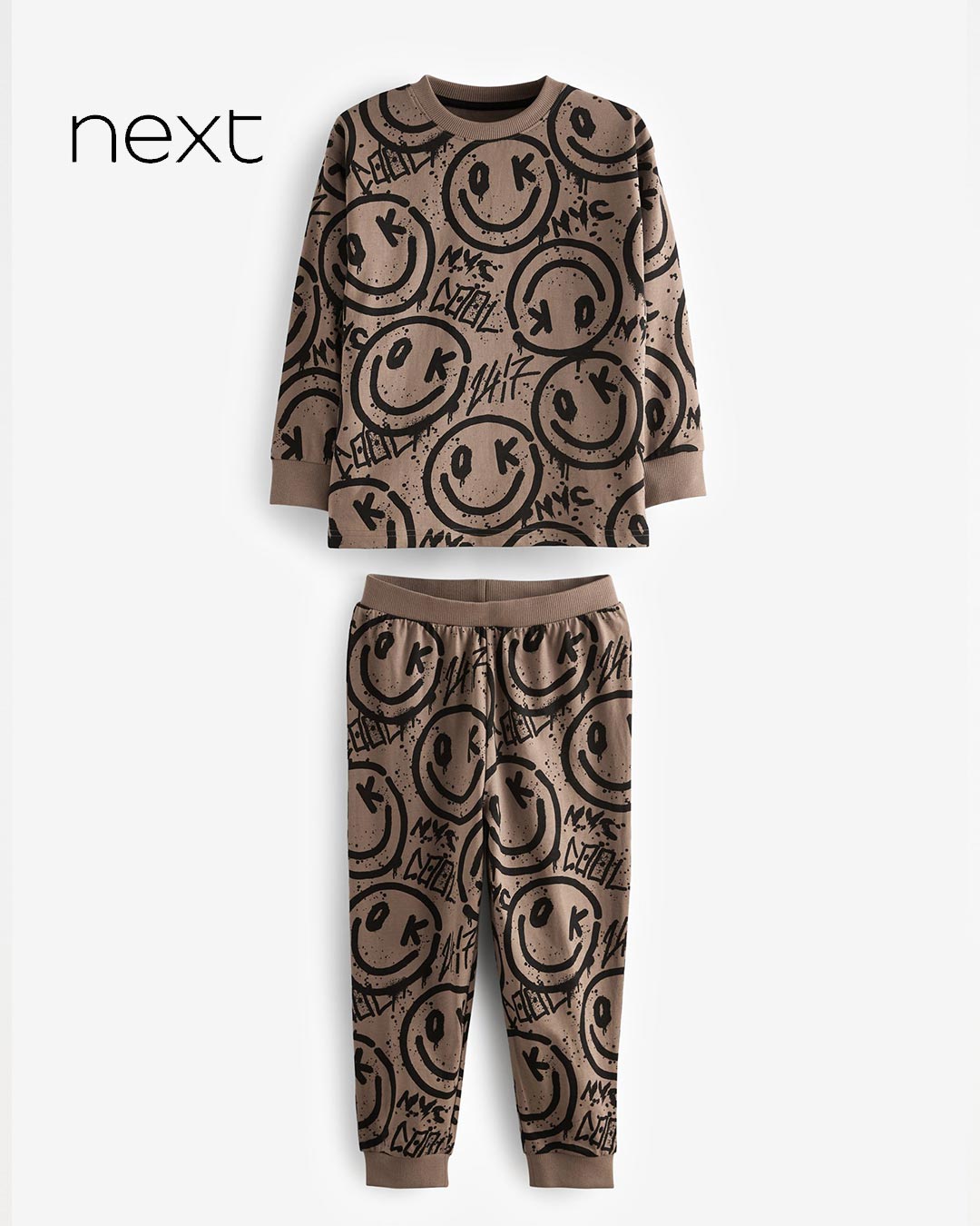 Taupe Smiley Graffiti Pajama Set – Chill Vibes Only Comfort meets cool in this smiley face pajama set. Covered in black graffiti artwork with fun icons and text, the taupe background adds a stylish twist. With ribbed cuffs and a relaxed fit, it’s a nighttime favorite for kids who like to stand out.