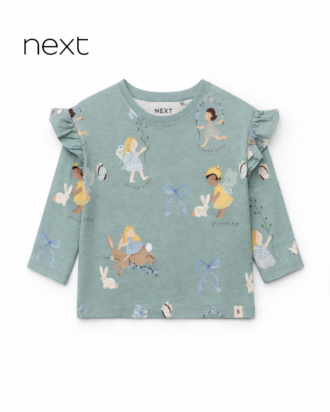 Add a touch of magic to your little one’s wardrobe with this adorable long-sleeve top. Designed in a soft sage green shade, it features a charming all-over fairy and woodland-themed print that brings a playful, storybook feel to everyday outfits. Sweet ruffle detailing on the shoulders adds an extra dash of charm.