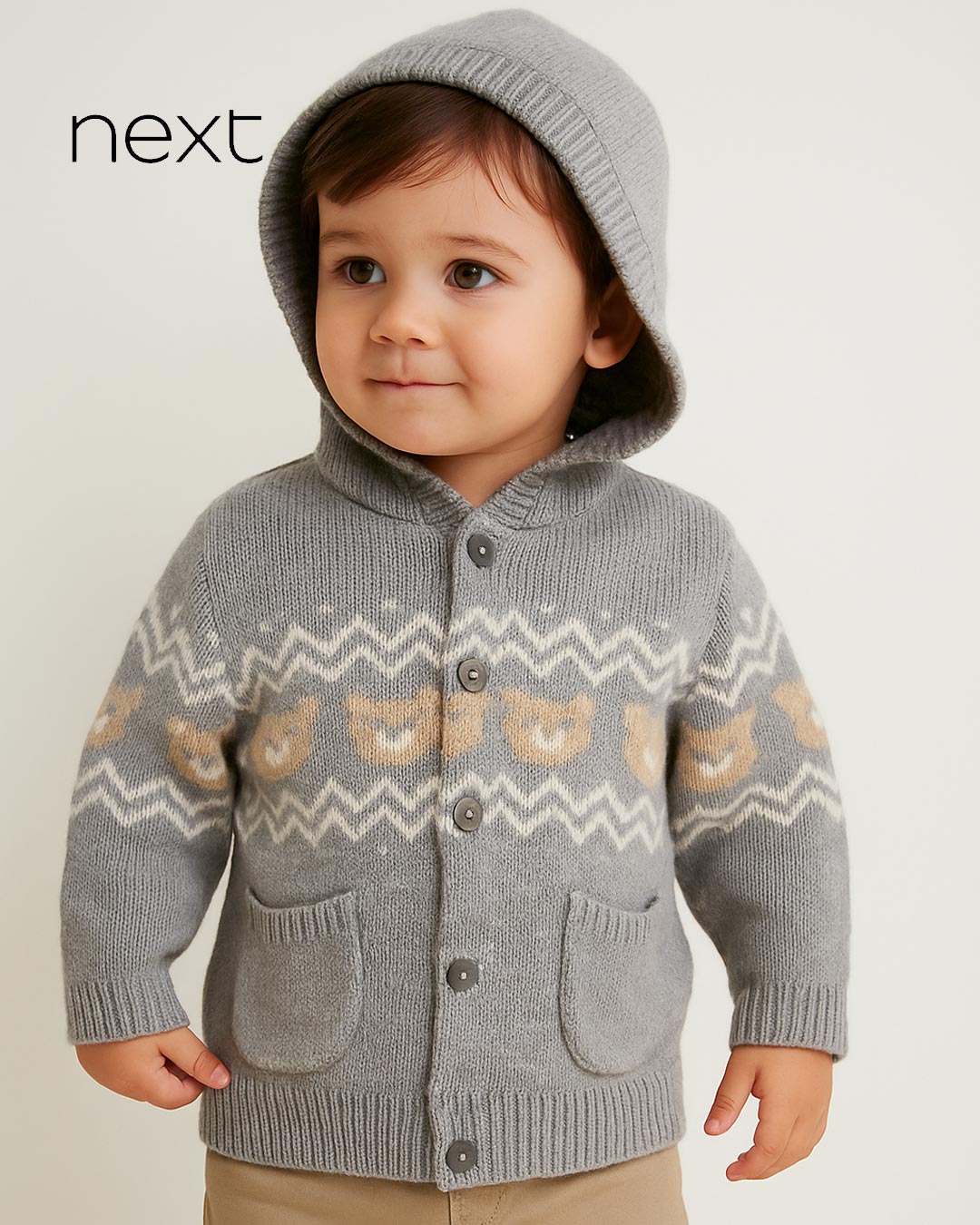 Adorable grey knitted hooded cardigan for boys, featuring cute bear patterns and a cozy front-pocket design. Made from soft, warm yarn — perfect for keeping your little one snug and stylish during chilly days.