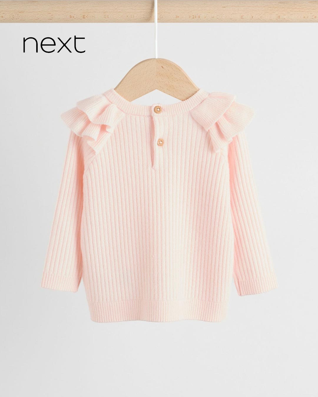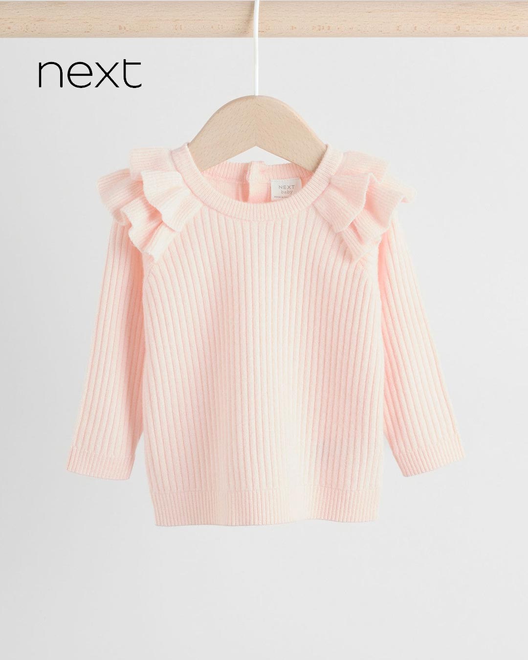 soft knitted fabrication. ruffle shoulders. crew neck.