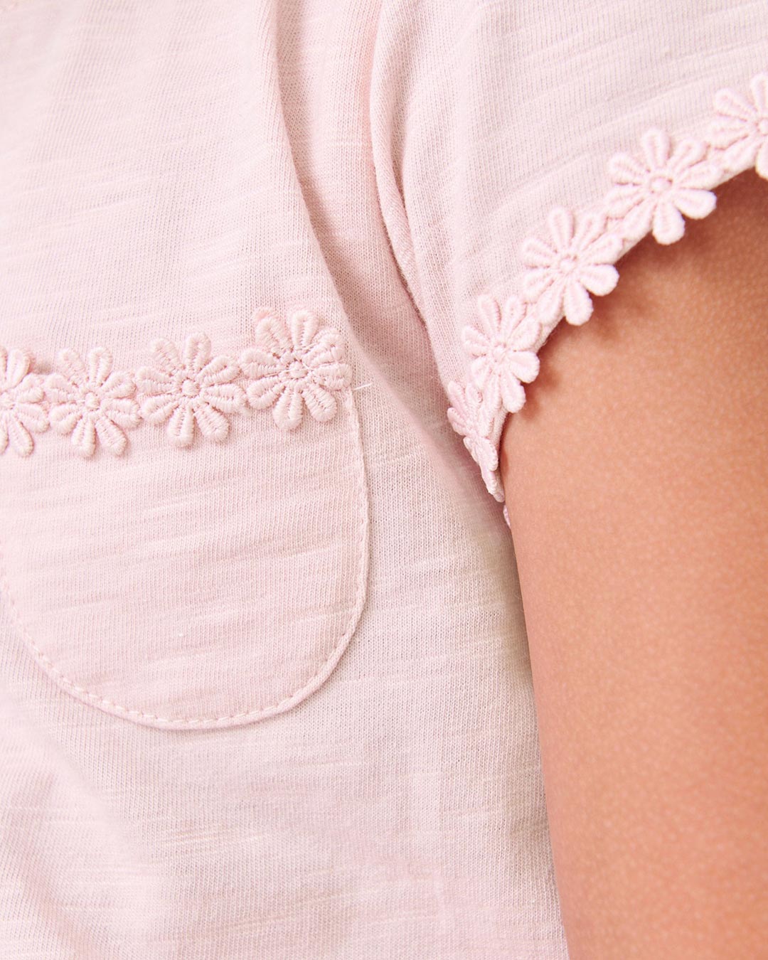 Description Regular fit. 180GSM fabric. Crew neck. Short sleeves. Pocket detail. Daisy trim on sleeve and pocket. 100% Cotton. Machine washable. 100% Cotton.