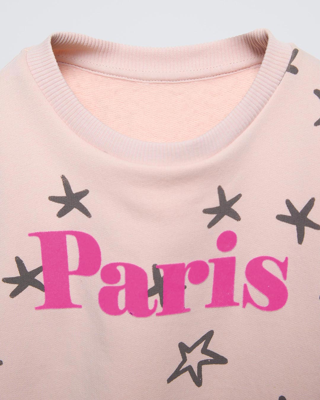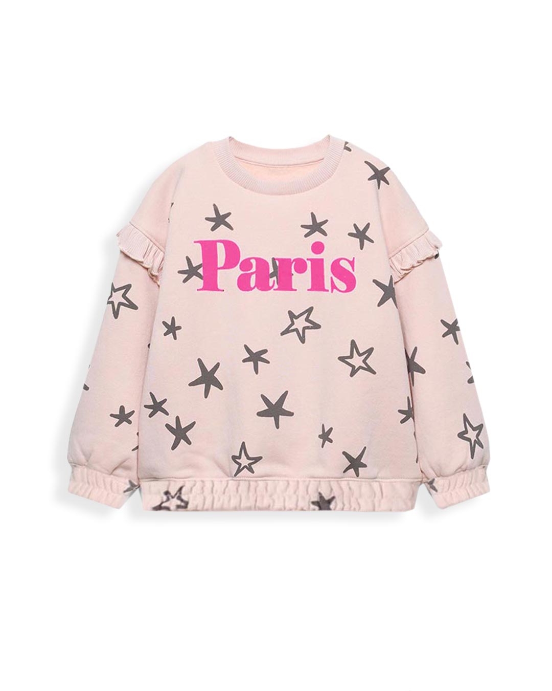 Add a sprinkle of Parisian charm to your little one's wardrobe with this cozy and playful. Crafted from soft cotton-blend fleece, this baby pink sweatshirt features a bold “Paris” print in vibrant pink, surrounded by whimsical hand-drawn black star motifs all over. The sweatshirt is finished with delicate ruffle details on the shoulders and elasticated cuffs for a snug fit