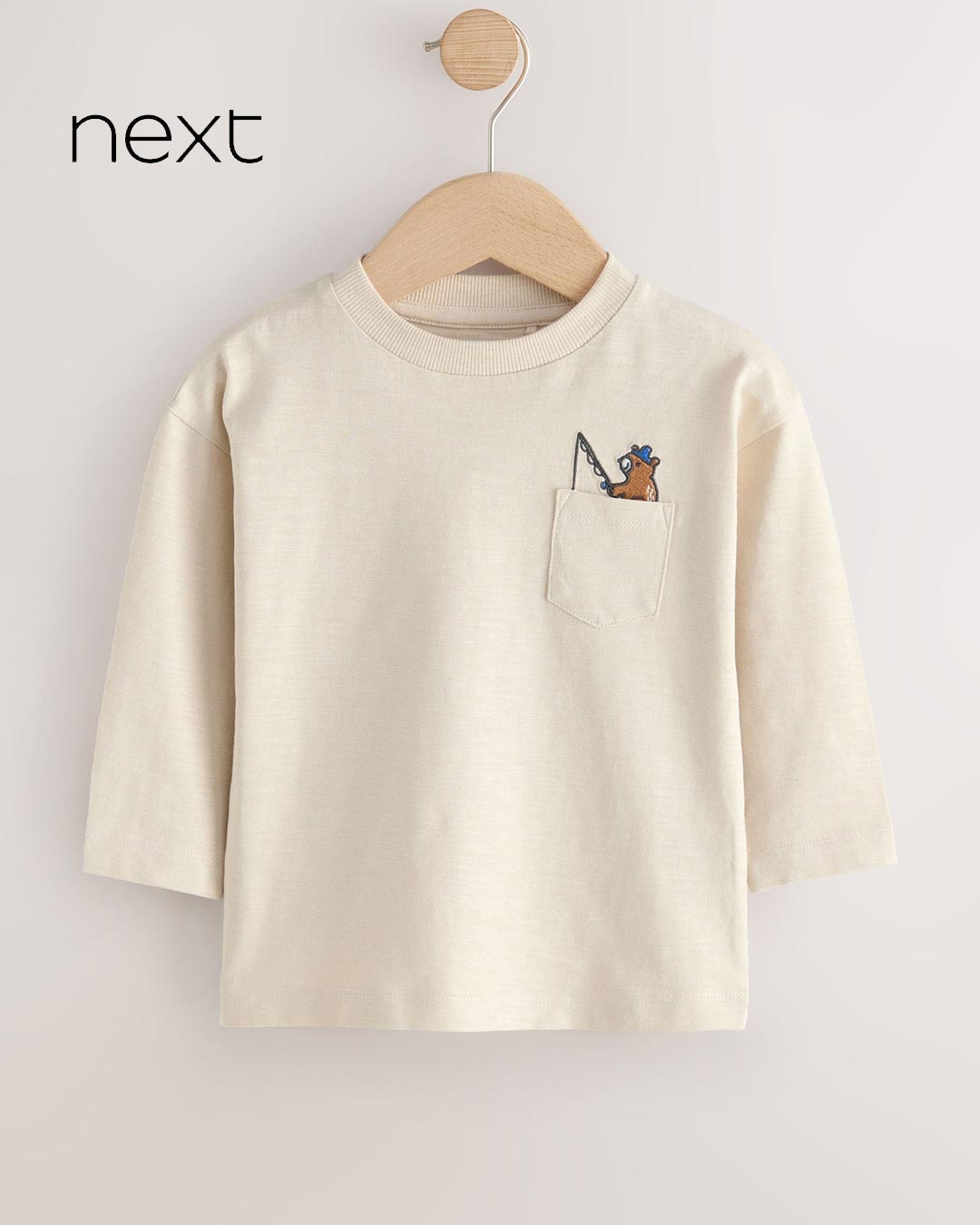 A sweet everyday essential with a playful twist, this long-sleeve T-shirt comes in a soft cream shade for a clean, timeless look. It features a cute chest pocket with a fun embroidered character peeking out, adding a charming detail kids will love.