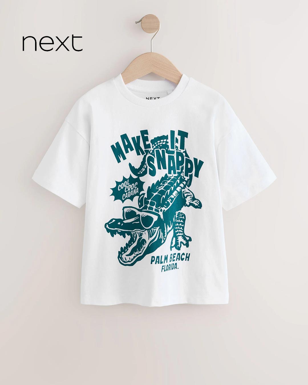 Add to their cool kid style with our relaxed fit white short sleeve t-shirt, featuring a green crocodile print. With an eye-catching design and comfortable relaxed fit, they'll look as cool as they feel.