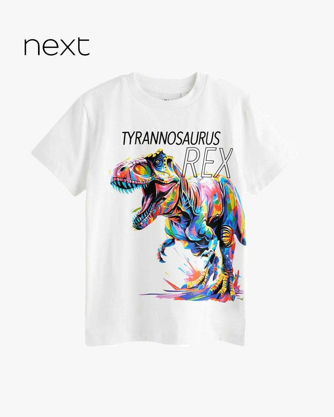 Vibrant Dinosaur Artwork: Showcases a large, dynamic Tyrannosaurus Rex graphic rendered in a stunning "technicolour" palette of neon blue, orange, yellow, and pink.