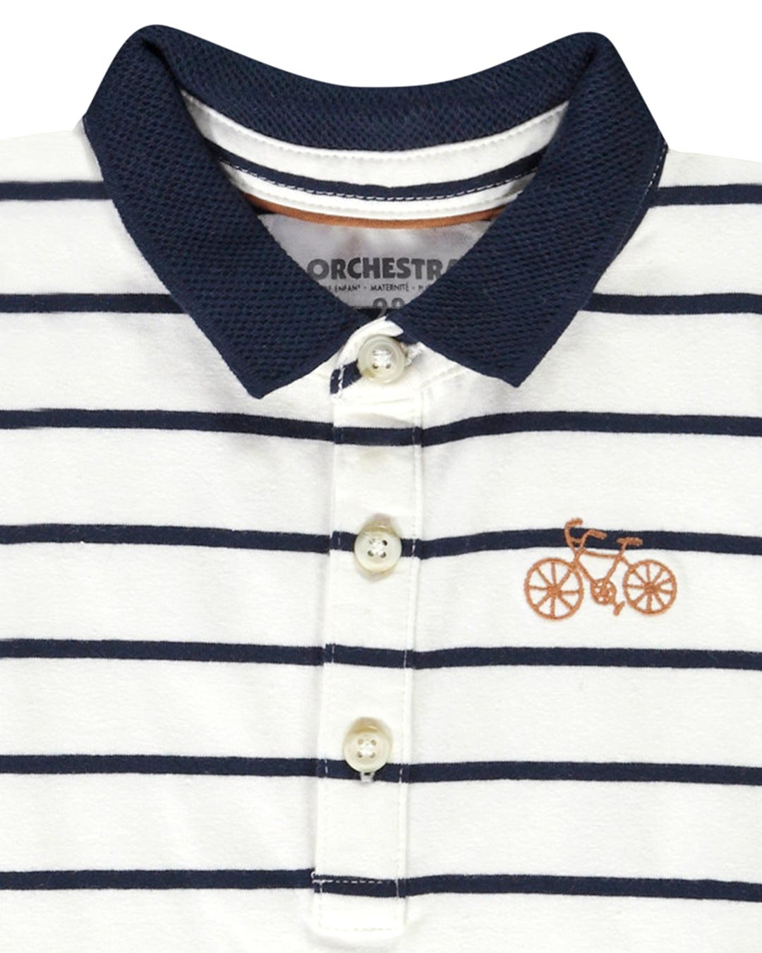 Theme: "Little Rider"   Long-sleeved jersey polo shirt. Ecru color. Scratches placed all-over. Contrasting jacquard shirt collar. Imitation horn buttoned tab at the front. Contrasting bike embroidery on the heart...