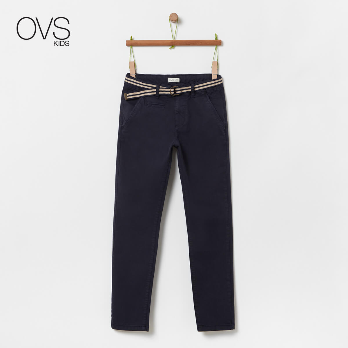 Solid colour stretch cotton trousers. Striped belt at the waist. Two welt pockets on the front. Welt coin pocket on the front. Two welt pockets with classic buttons on the...