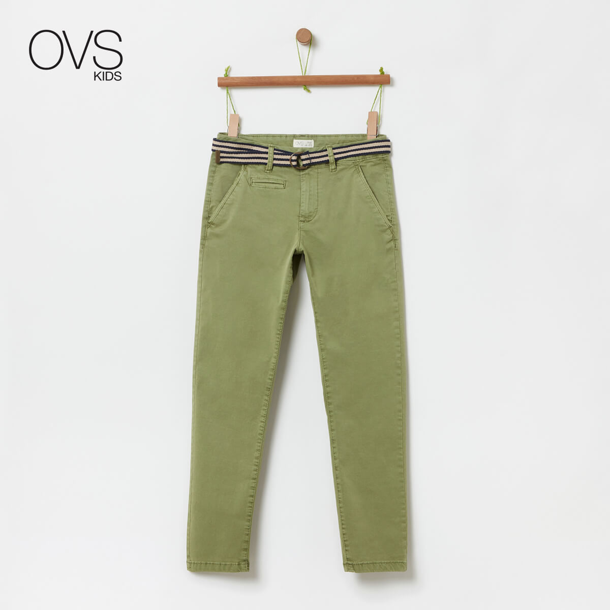 Solid colour stretch cotton trousers. Striped belt at the waist. Two welt pockets on the front. Welt coin pocket on the front. Two welt pockets with classic buttons on the back. Zip and button fastening.