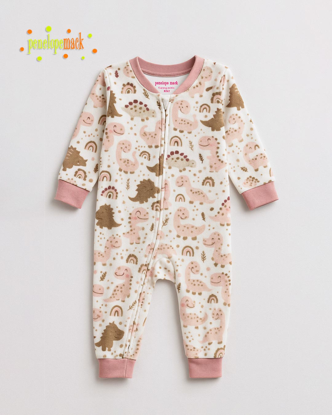 Soft Fleece Baby Zip Romper – Pink & Beige Dino Print