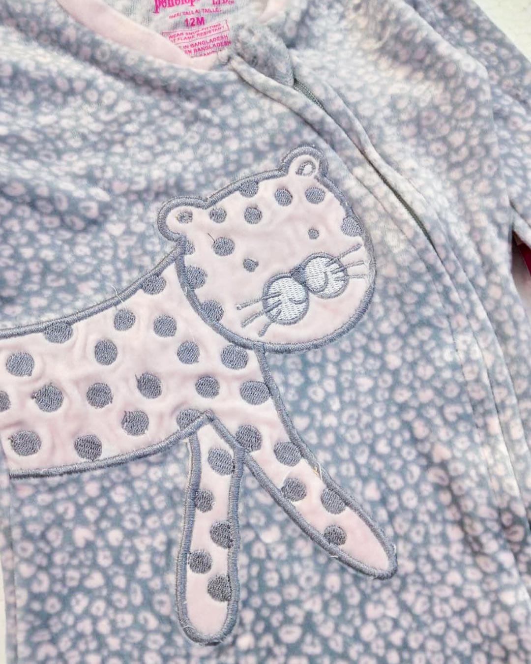 Keep your little one warm and stylish with this adorable fleece baby romper featuring a playful pink leopard appliqué. Designed in a soft grey and blush pink color palette with a subtle all-over dot pattern, this romper adds a cute, cozy charm to everyday wear.