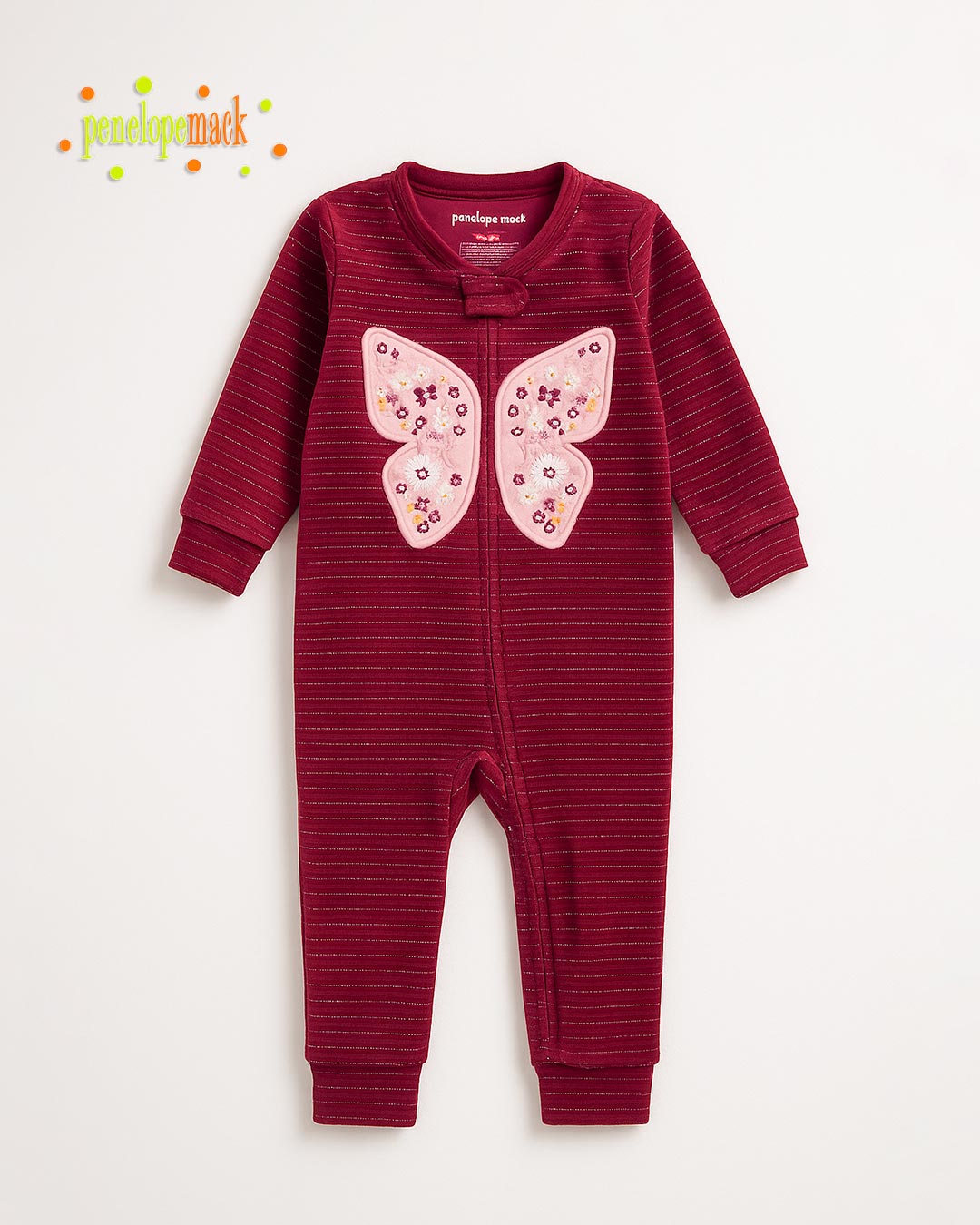 Designed in a rich burgundy tone with subtle textured stripes, it features an elegant embroidered butterfly applique on the front, detailed with delicate floral stitching for a premium look. The full-length front zipper allows quick and easy dressing, while the ribbed cuffs at sleeves and ankles ensure a snug yet flexible fit.