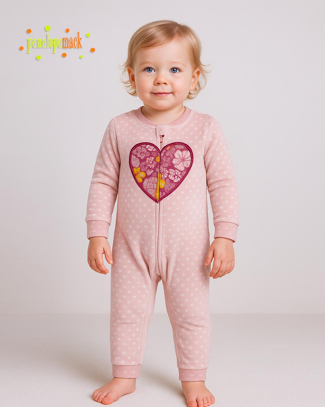 This adorable pink fleece baby romper is designed for all-day comfort with a sweet, feminine touch. Made from ultra-soft, cozy fabric, it features a delicate white polka-dot pattern and a beautifully embroidered floral heart appliqué at the chest — adding the perfect pop of charm.