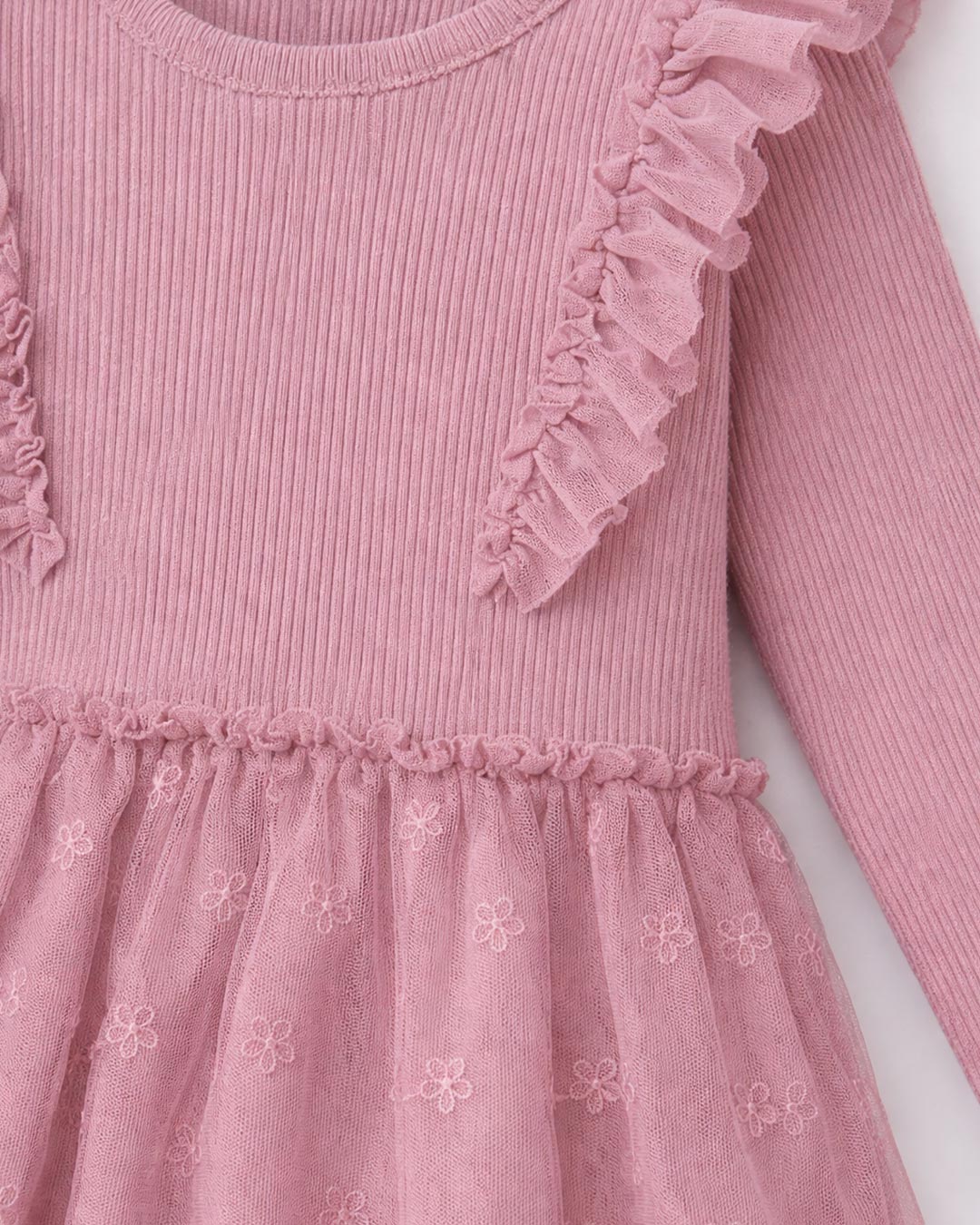 Soft, sweet, and made for little twirls — the Blush Bloom Frill Knit Tulle Dress is designed for comfort with a touch of elegance. The ribbed knit bodice keeps your little one cozy and stretch-comfortable, while delicate shoulder frills add a charming, playful detail. The airy embroidered tulle skirt features subtle floral motifs and a scalloped lace hem for a dreamy finish.
