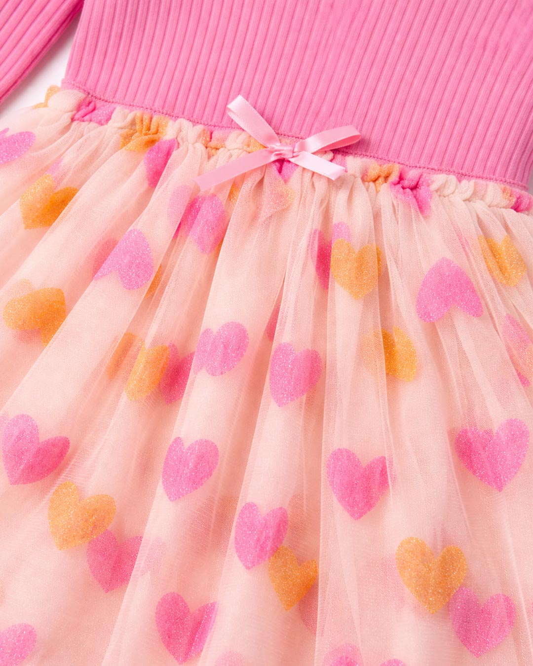 Full of love, color, and twirl-worthy fun — the Candy Hearts Twirl Tulle Dress is made to brighten every little moment. Designed with a soft ribbed knit pink bodice for cozy comfort and a lightweight tulle skirt covered in playful heart prints, this dress is the perfect mix of cute and comfy.