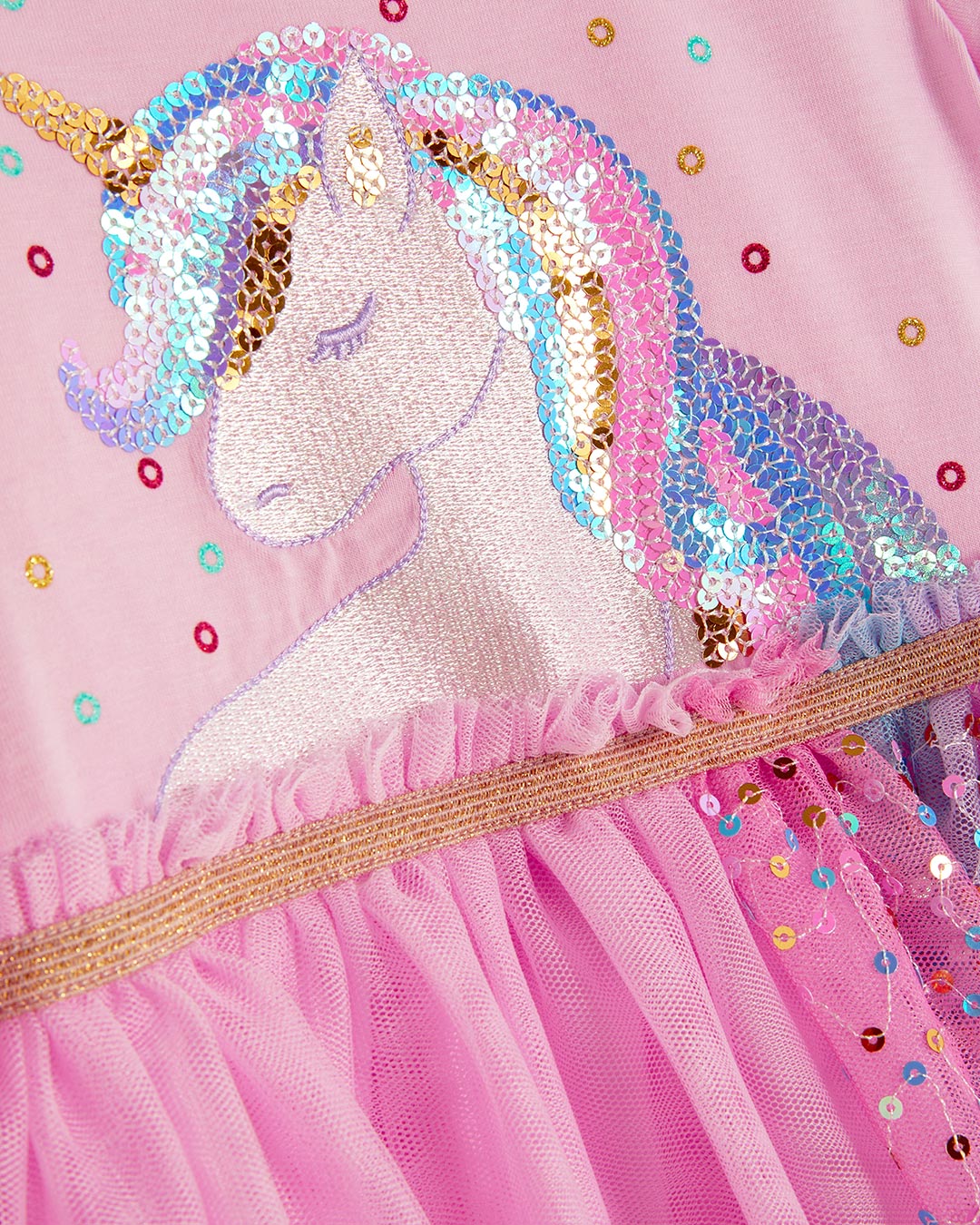 Let her step into a world of magic with the Unicorn Dream Sparkle Tulle Dress. Designed with a soft blush pink knit bodice and charming frill sleeves, this dress combines everyday comfort with fairy-tale sparkle.