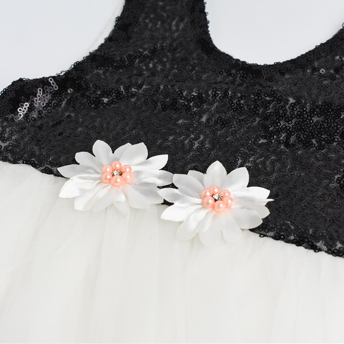 DESCRIPTION Tulle Dress with Sequins at top featuring Flower with shiny lace and a flared skirt with multiple layers of tulle.