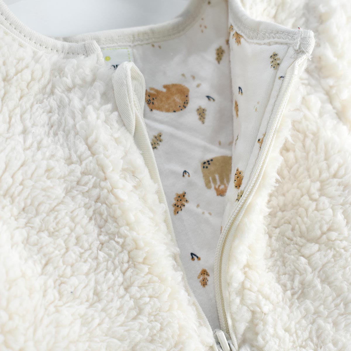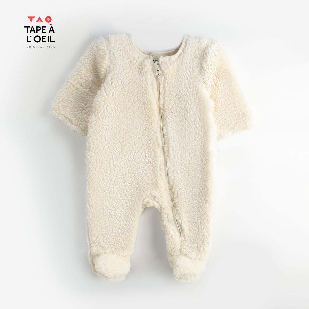 faux shearling one-piece suit with long sleeves. Featuring a zip-up front and matching warm fabric lining.