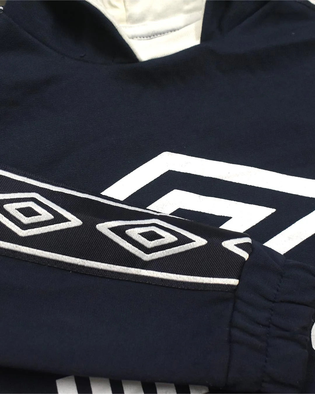 The sweatshirt features the iconic Umbro logo on the front, contrast white piping along the sleeves, and ribbed cuffs and hem for a snug fit.