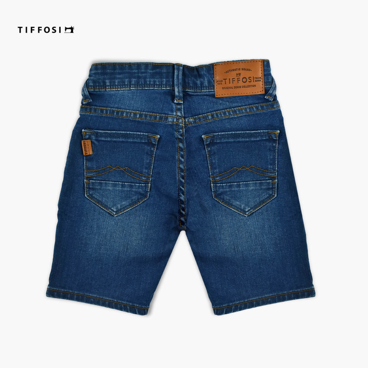 Blue denim shorts for boys, with Zip and Button fastening at the waist.