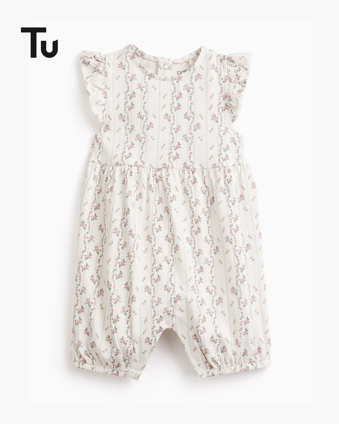Practical and cute, this baby romper features a delicate print all over and frill detailing on short capped sleeves. Finished with press-button fastenings for care-free dressing.