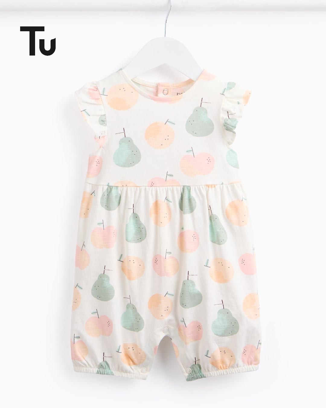 Practical and cute, this baby romper features a delicate fruit print all over and frill detailing on short capped sleeves. Finished with press-button fastenings for care-free dressing.
