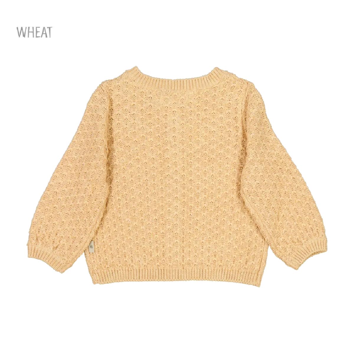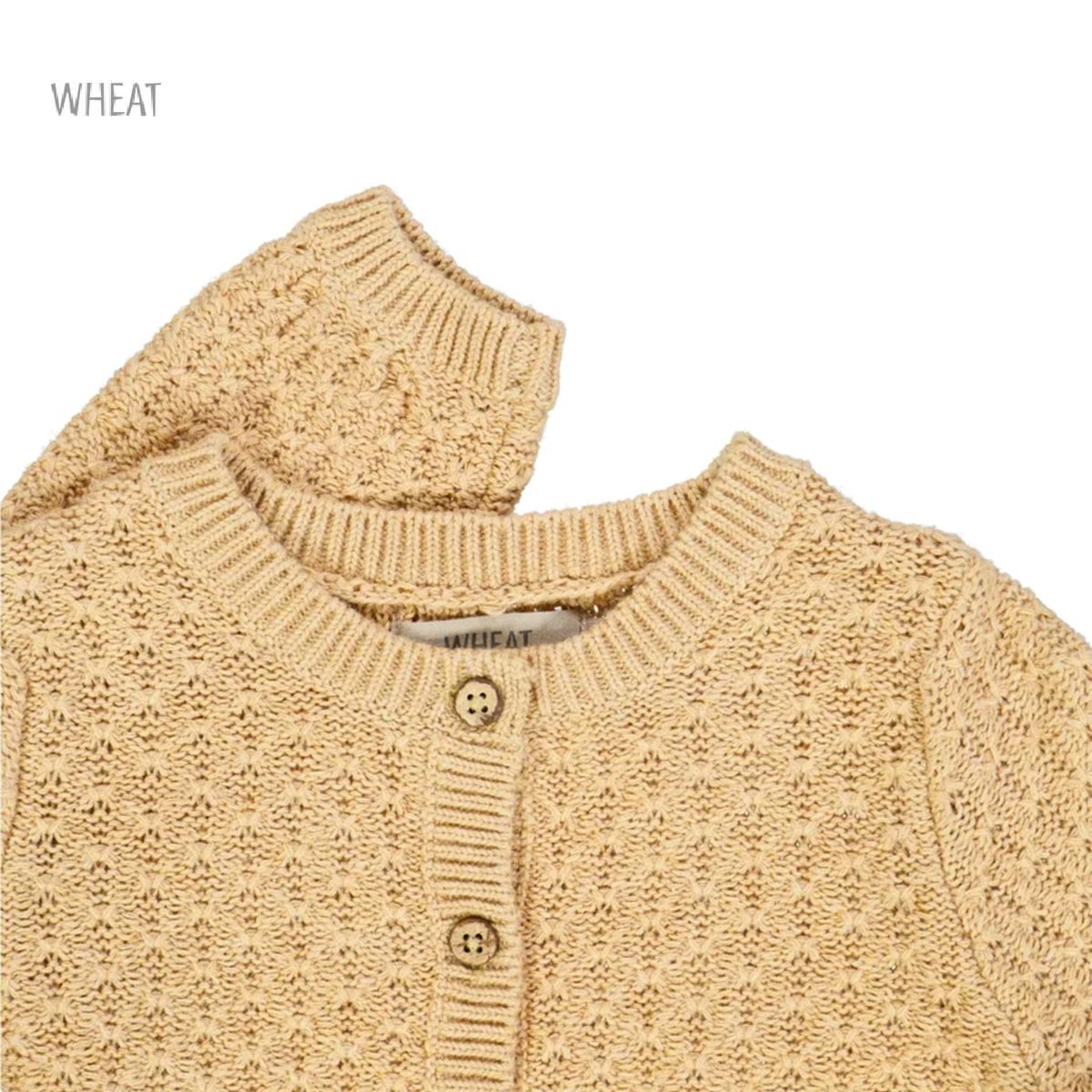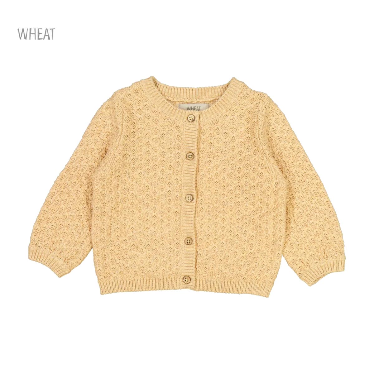 Cardigan from Wheat Adorable Wheat cardigan in cream white knitted. The Wheat cardigan has long sleeves and is opens at the front with through buttons. In all openings there are wide ribbed edges and it is in a delicious and stretchable cotton quality. Made with: – 100% organic cotton