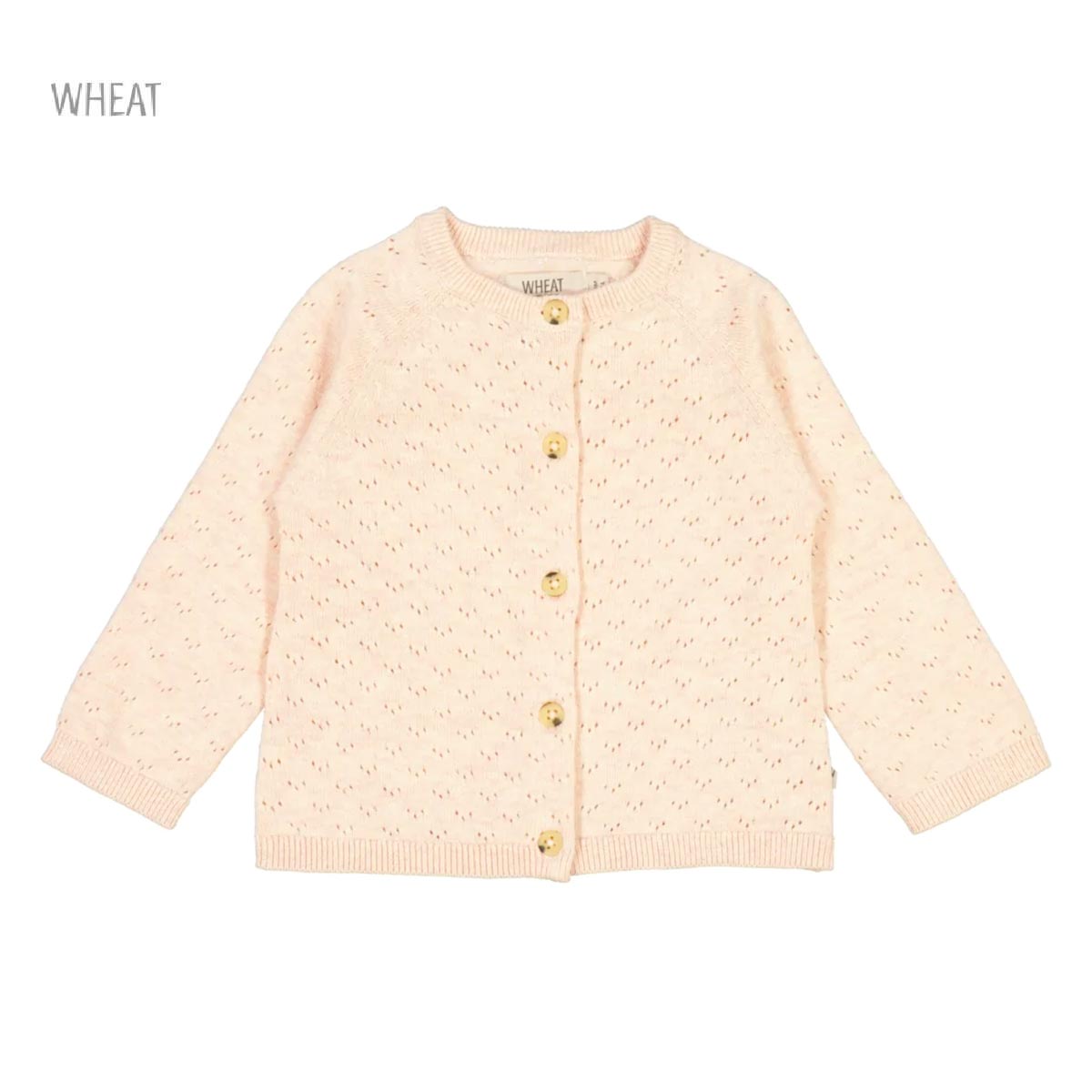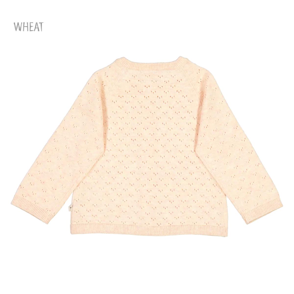 Cardigan from Wheat Adorable Wheat cardigan in cream white knitted. The Wheat cardigan has long sleeves and is opens at the front with through buttons. In all openings there are wide ribbed edges and it is in a delicious and stretchable cotton quality. Made with: – 100% organic cotton