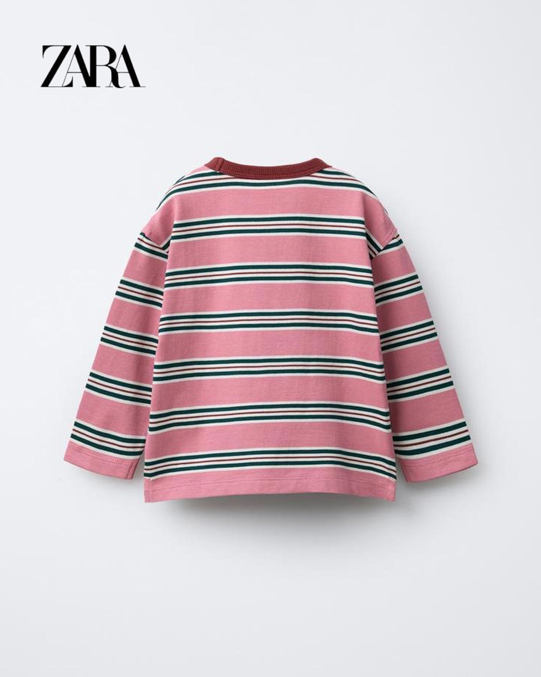Long sleeve T-shirt with a contrast colour ribbed round neck. Featuring a stripe print. Made from 100% cotton.