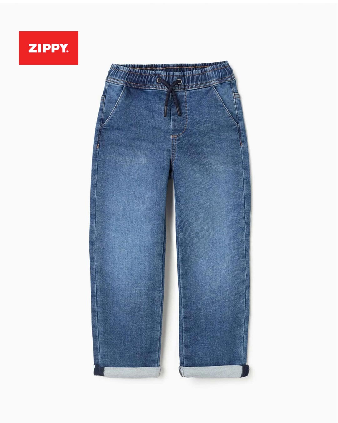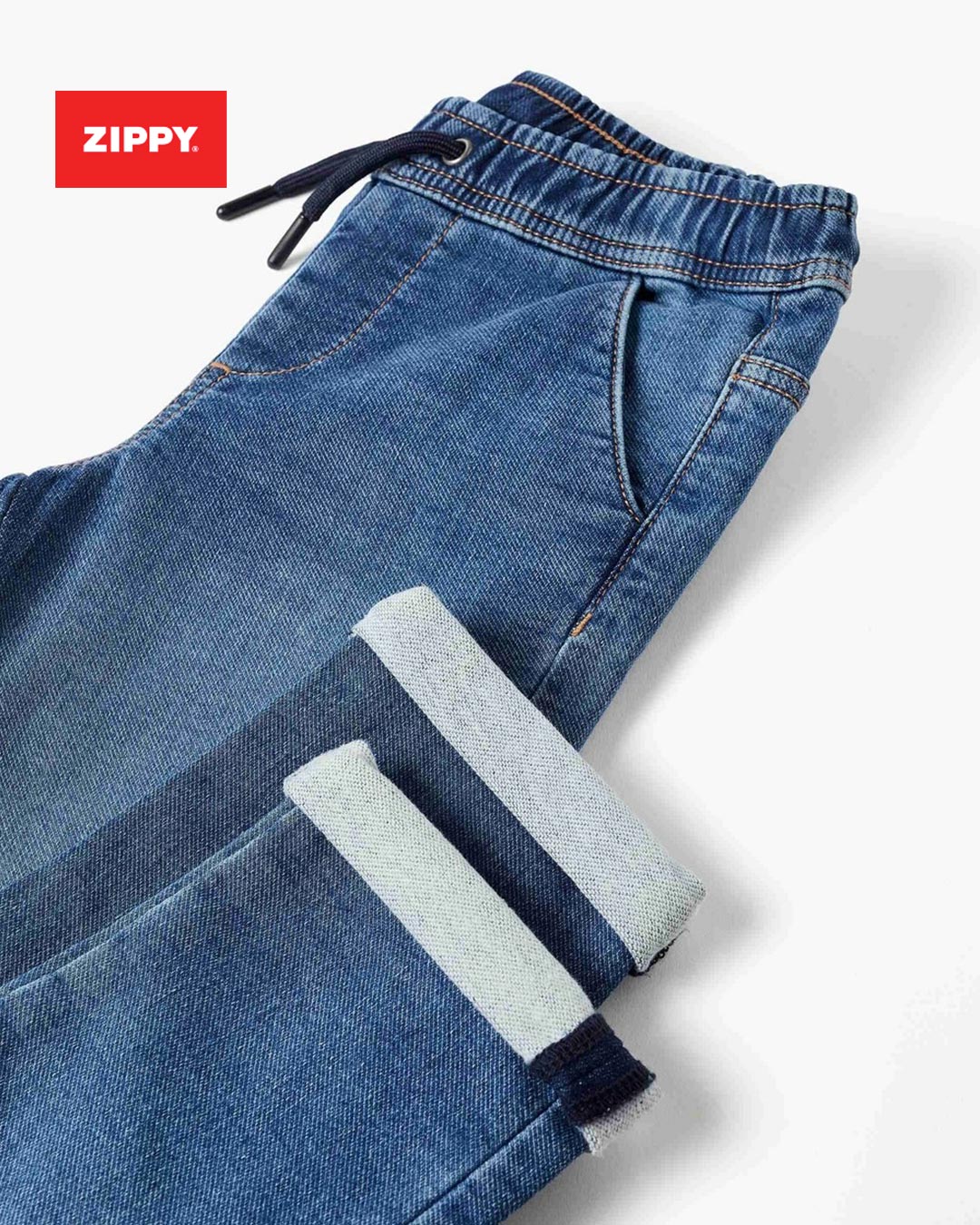 Discover the perfect combination of comfort and versatility with these blue boys' joggers from Zippy. They are a must-have in every boy's wardrobe and can be easily combined with T-shirts, sweatshirts and sweaters. Elastic waist, adjustable with a drawstring on the outside and with elastic and buttons on the inside. Fold-over hem